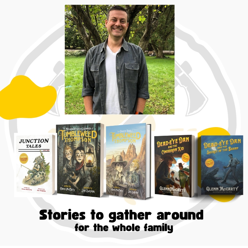Glenn McCarty is the author of the Tumbleweed Thompson Adventures, and the Dead-Eye Dan novels. He teaches middle school English in Western New York, where he lives with his wife and children in a small town that’s pretty much Mayberry. But without Don Knotts. Bummer. He finds campfires and banjo music two of life’s simple pleasures. And pie.